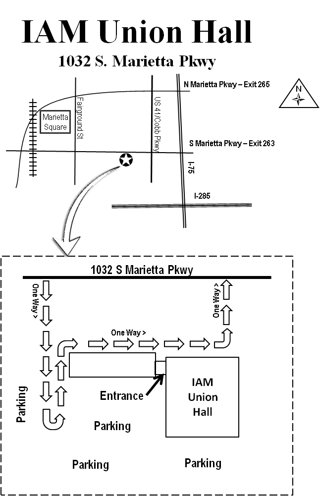 From I-75, take exit 263 for the South Marietta Parkway. Go west, cross over US 41/Cobb Parkway and the IAM Union Hall will be on your left just past the Kennesaw University Marietta Campus entrance.