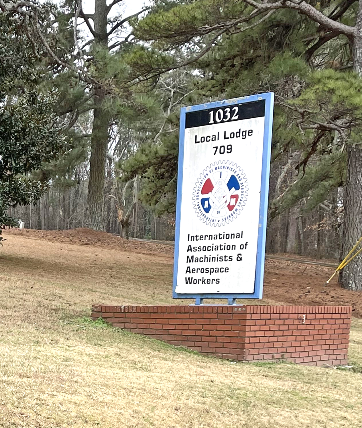 Street sign shows Local Lodge 709 International Association of Machinists and Aerospace Workers.