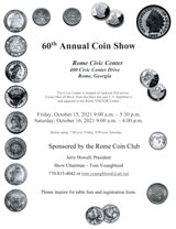The Rome Coin Club will be holding their 60th annual coin show on Friday, October 15, and Saturday, October 16, 2021 at the Civic Center in Rome, Georgia.