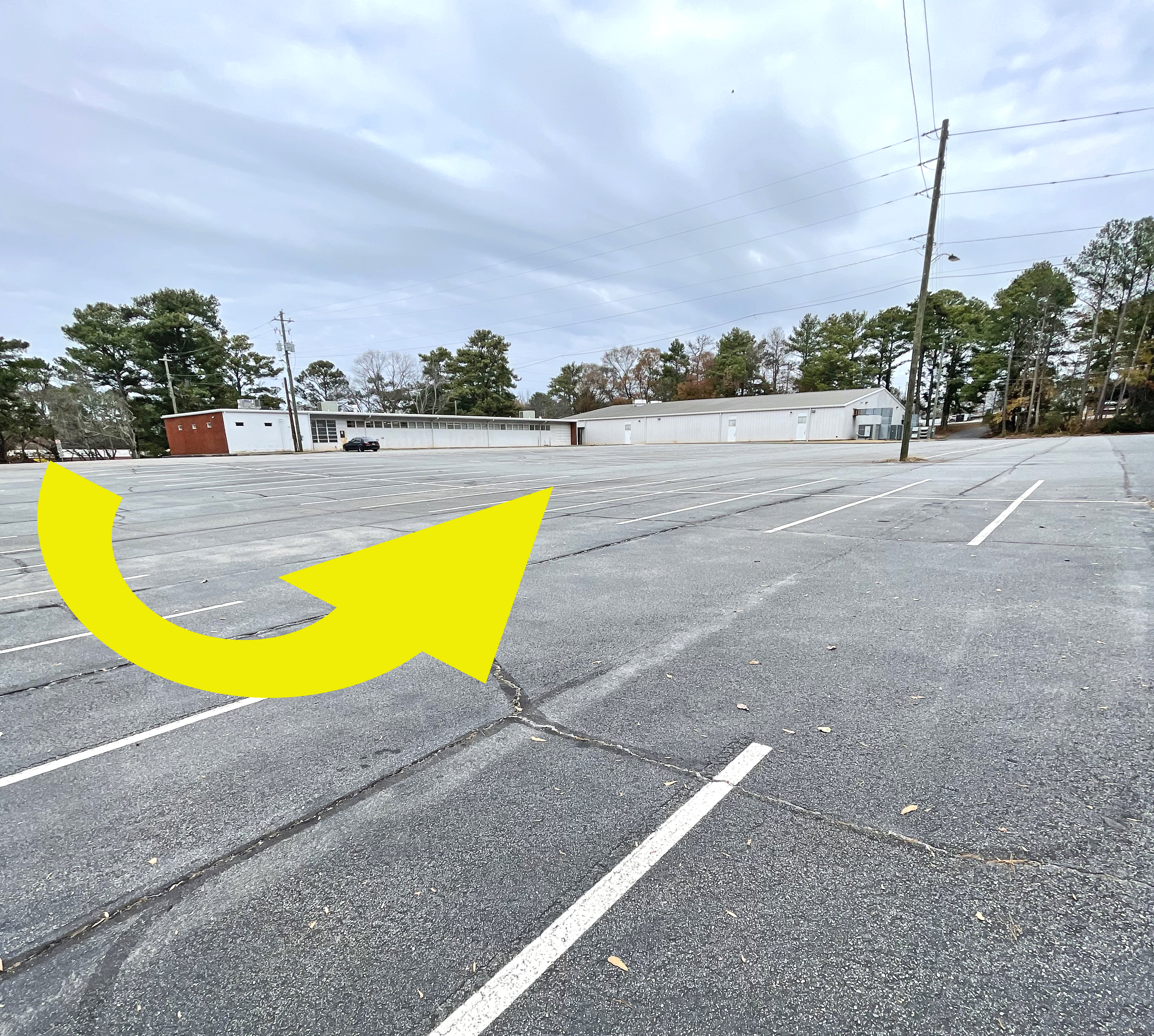 Take the right driveway up the hill and follow the paved pathway to the right to access the parking area behind the office building.